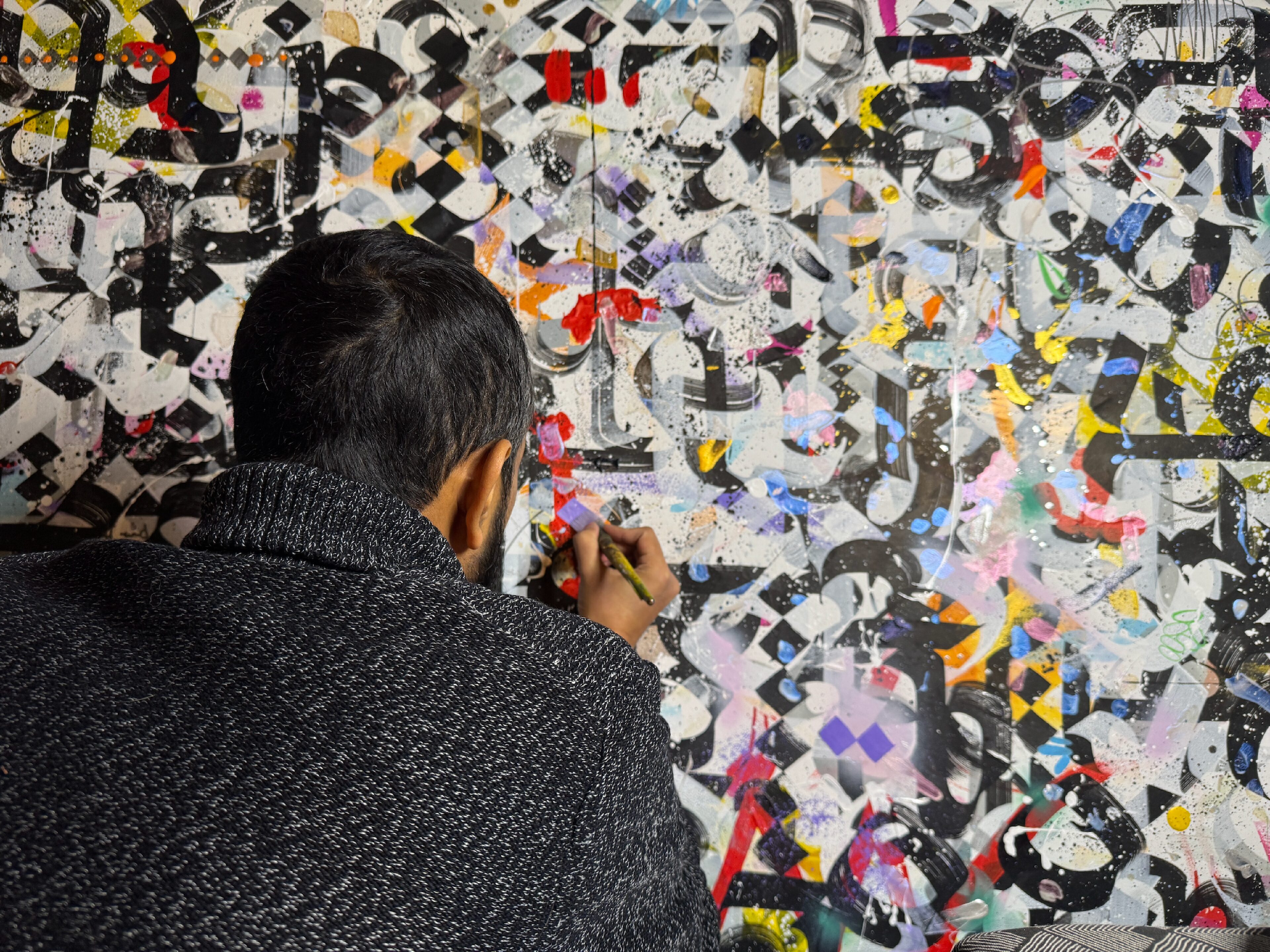 Zaman’s work solidified over a decade ago around an affirmation of life. Layered compositions rooted in public engagement, Calligraffiti, tensions between language, legibility, and meaning in sprawling English, Bengali, and Arabic, inviting viewers to “read the illegible,” encouraging curiosity, mutual respect, and reflection despite the impossibility of fully understanding one another. Again and again, in moments when violence was carried out in the name of power, slaying innocents as collateral to a nation’s war against its own shadow, Zaman’s work—insistent, undeniable—was to say there is beauty in the lives that we ignore, and humanity. That innate sense of the preciousness of life takes on new dimension now.